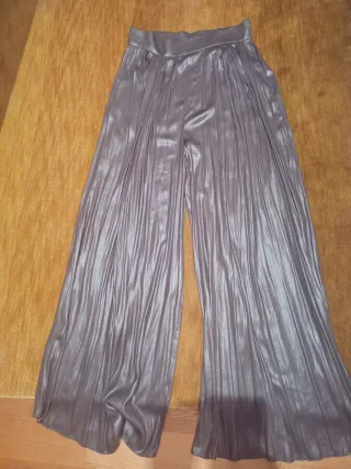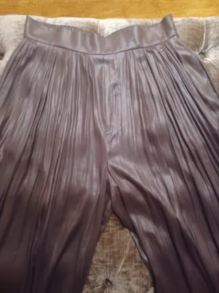 Pantalones de Zara, color violeta clarito. Son de un tejido satinado y tienen un corte elegante. Aberturas en parte baja. Cremallera baja. Hacen una bonita figura. Talla M. - Son nuevos con etiqueta. - Están hechos de un material suave y fluido.