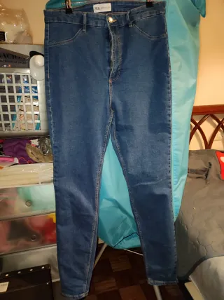 Pantalones vaqueros de la marca Zara en color azul. - Corte ajustado. - Cintura alta. - Cierre de cremallera y botón.