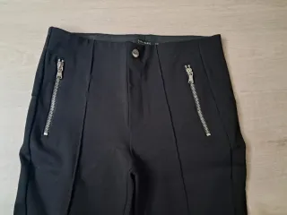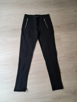 Pantalones tipo legging de Zara en color negro. Cuentan con un diseño ajustado y detalles de cremalleras decorativas en los bolsillos delanteros. - Cremalleras plateadas en los bolsillos. - Costuras marcadas en la parte delantera y trasera de las piernas.
