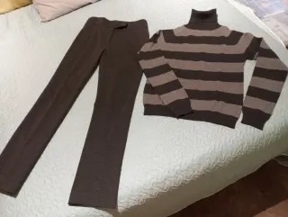 Conjunto de pantalón tipo vaquero de elastan marrón de Zara talla S , y chaqueta punto beige talla S, larga de Primark , totalmente nueva