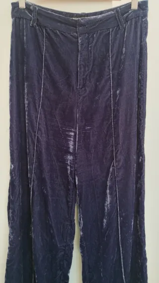Pantalón de terciopelo efecto arrugado con costura central y apertura lateral interna en el bajo. Díseño de pierna ancha. Tejido suave y ligero.