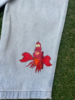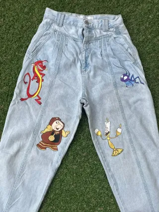 Pantalón vaquero de mujer con un diseño único pintado a mano. - Personajes de Disney: Mushu, Cri-Kee, Lumière y Ding Dong. - Estilo vaquero clásico. - Lavado claro. Talla 36 , marca stradivarius .