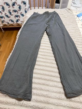Pantalón de gasa en color verde oliva. Es ligero y cómodo, con un diseño de pierna ancha. - Cintura elástica con cordón. - Bajo con detalle deshilachado.
