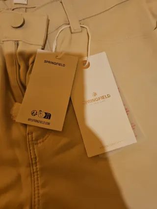 Pantalones de corte recto en color beige. - Cintura con trabillas y cierre de botón. - Bolsillos laterales. - Detalle de costuras en las rodillas.