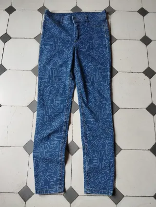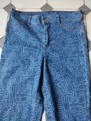 Pantalones tipo leggings con un diseño llamativo del artista Keith Haring. Usados dos veces talla M en perfecto estado - Estampado de figuras blancas sobre fondo azul. - Corte ajustado. - Cintura alta.