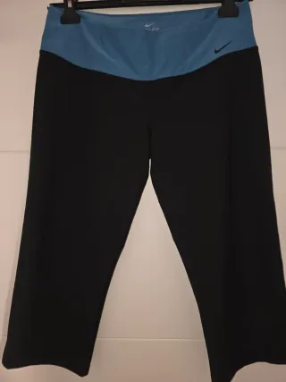 Pantalones tipo leggins de la marca Nike con tecnología Dri-Fit. - Combinación de colores negro y azul. - Cintura elástica ancha.