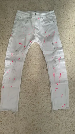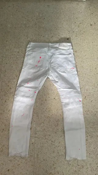 Pantalón blanco con un diseño único de salpicaduras rojas. Casi sin usar, en excelente estado. - Diseño con salpicaduras de pintura roja. - Estilo desgastado con rotos. - Bajo deshilachado.