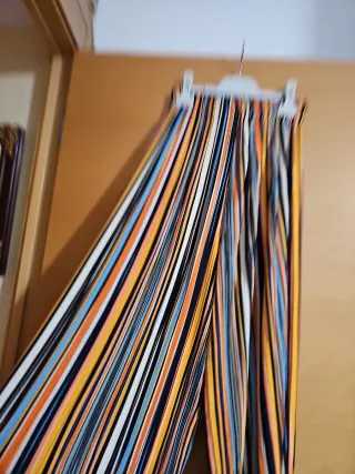 Pantalón de corte ancho con un llamativo estampado de rayas verticales. - Diseño de rayas multicolor. - Cintura elástica. - Piernas anchas y fluidas.