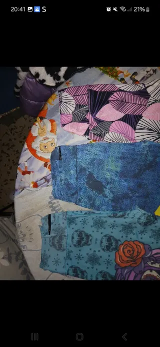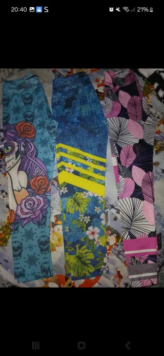 mayas con diseños llamativos. - Estampado floral en tonos rosas y negros. - Diseño abstracto en azul. - Estampado de calaveras y rosas en azul claro. Bolsillos detrás con Cremallera. - Sin usar dos de ellos.