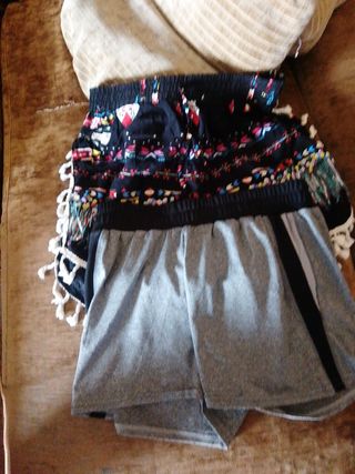 Dos pantalones cortos ideales para el verano. Uno de ellos es de color negro con estampado étnico y flecos, el otro es gris. Ambos son talla L. Están en buen estado.