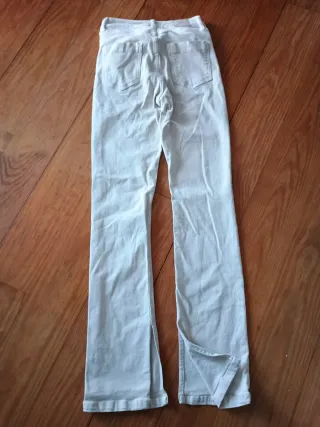 Pantalón vaquero de color blanco, con un diseño moderno y cómodo. - Corte acampanado. - Bajo deshilachado. - Cierre de botón y cremallera.