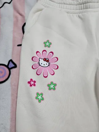 Pantalones deportivos de color crema con un divertido diseño. - Estampado de Hello Kitty con flores en la pierna izquierda. - Diseño de graffiti con flores en la pierna derecha. - Cintura elástica.