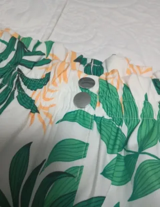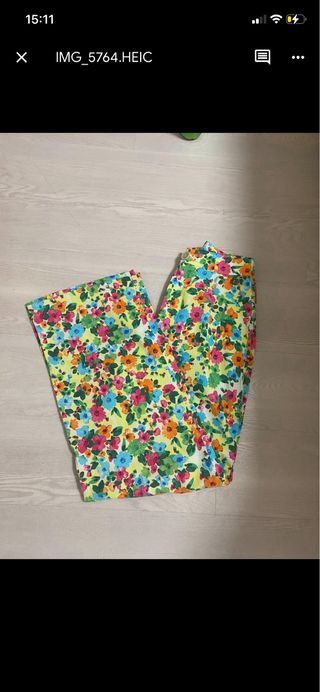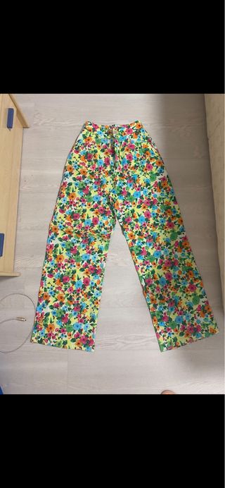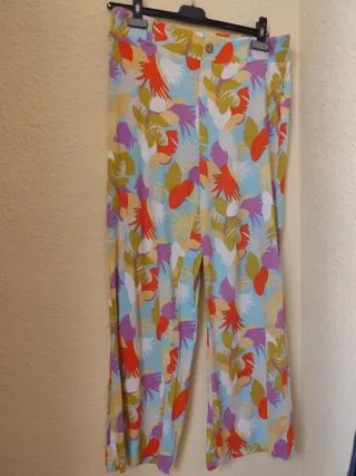 Pantalón estampado floral Stradivarius talla S. Color: blanco, naranja, amarillo, verde , azul y rosa - Diseño de pierna ancha. - Cintura alta. - Tejido ligero y cómodo. MEDIDAS: - largo: 109 cm - cintura: 34 cm