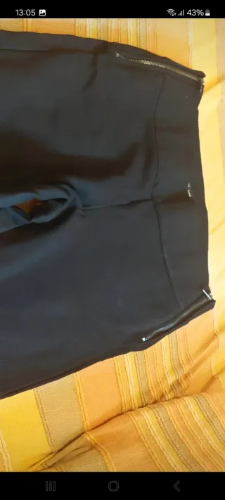 Leggins negros con cremalleras en los laterales visibles de frente, son reales, se abren para poner y quitar el pantalón. Goma en la cintura, tela gorda elástica. Miden 40 cm de cintura y 91 de largo. Indica talla XL, quizá mejor talla L. Muy poco uso.