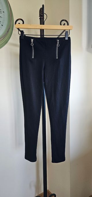 Pantalones negros para niña, tipo leggings. Son de tiro alto y tienen cremalleras en los laterales. Están en buen estado. - Diseño de tiro alto - Cremalleras laterales