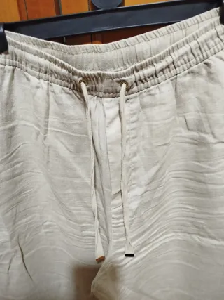 Pantalones largos de lino en color beige. Con goma en la cintura y tiene cordòn para atar también -Bolsillos: uno a cada lado y dos atrás. - Talla: XS. ZARA - Largo: 92cm. - Tela: Lino.