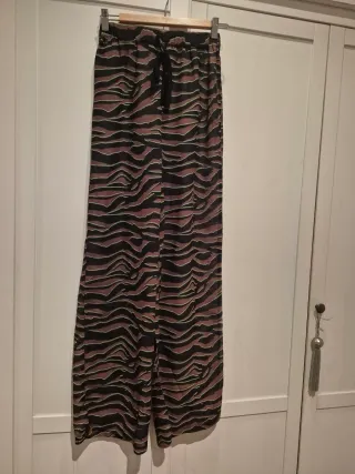 Pantalones largos con un llamativo estampado de cebra. Colores negro, marròn y verde. - Largo 1m 10cm. - Diseño recto/ancho. - Cintura con cordón ajustable y goma. - Tejido ligero y fluido.