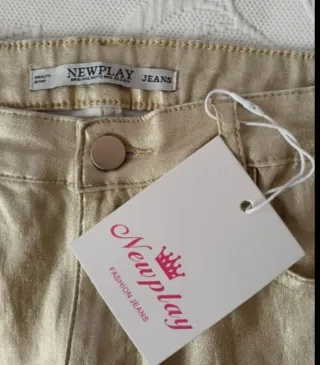Pantalón de corte recto con un acabado brillante. - Color dorado metálico. - Diseño de cinco bolsillos. - Cierre de cremallera y botón.