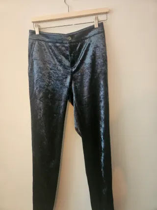 Pantalón elegante de terciopelo con un acabado brillante. Es verde oscuro.