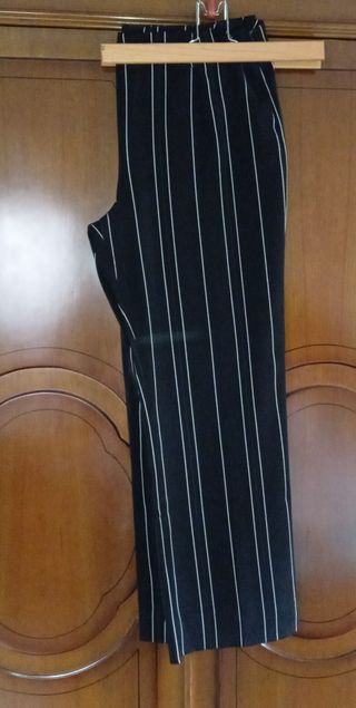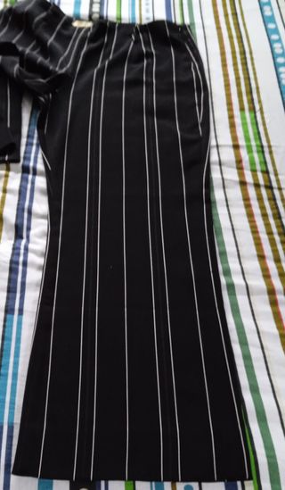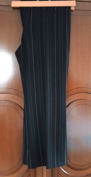 Pantalón negro con rayas verticales y corte acampanado. Pantalon Rayas..Acampanado Talla 48 Usado vez El genero es elastico - Diseño de rayas finas. - Pierna acampanada.