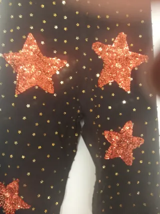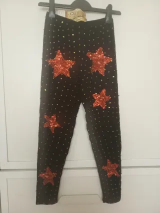 Leggings negros con lentejuelas doradas y aplicaciones de estrellas rojas. Las estrellas están cosidas a mano , calidad máxima - Diseño llamativo. - Tejido elástico.