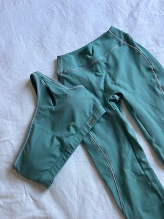 Leggings de tiro medio en color Ash Green Melange. Diseñados para un ajuste cómodo y favorecedor. - Tejido suave y elástico. - Cintura alta. - Detalle de fruncido en la parte trasera.