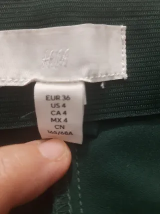Pantalón de corte recto en color verde oscuro. - Cintura con trabillas. - Bolsillos delanteros. - Cierre de cremallera y enganches metalicos. - elástico con cintura engomada - mide: cintura 36, cadera 50, ancho del bajo 15 y largo 95 cm. - algodón, poliester y elastano