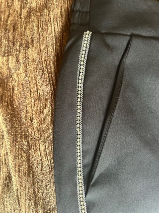Pantalón negro elegante, ideal para eventos o fiestas. Talla XL. Pantalón negro Ideal fiesta Talla XL Marca Encuentro Detalle pedrería plateado Nuevo con etiquetas Diseño con raya lateral plateada. Tejido ligero y cómodo