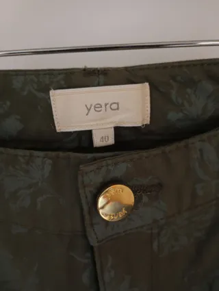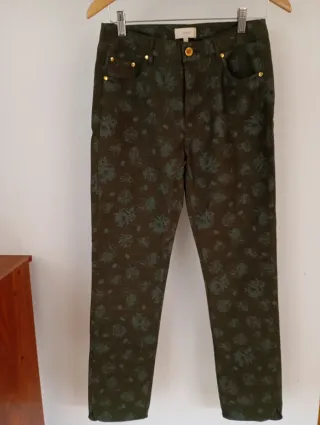 Pantalón de mujer con un bonito estampado floral. - Diseño en tono verde y verde oliva. - Detalle de botones dorados en la parte delantera. - Bolsillos prácticos.
