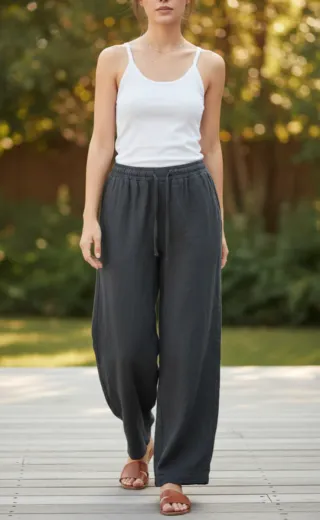 Pantalones largos de lino en color negro. Son cómodos y versátiles.