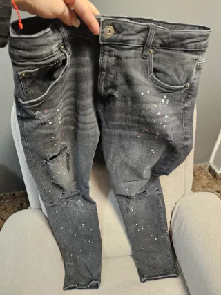 Pantalones vaqueros de corte ajustado con un diseño moderno y desgastado. - Detalle de rotos en las rodillas. - Efecto salpicaduras de pintura blanca. - Tiro medio. 3 MAS EN MI PERFIL LOS 4 VAQUEROS..... 35€