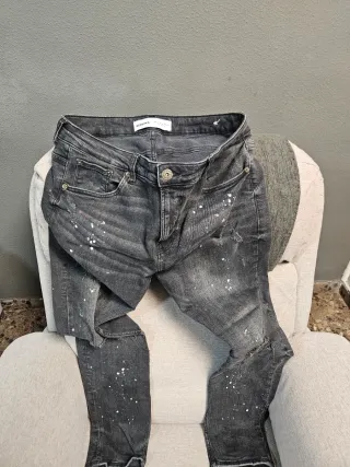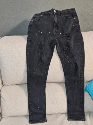 Pantalones vaqueros grises con un diseño moderno y desgastado. Presentan salpicaduras de pintura en varios colores y rotos. - Diseño con salpicaduras de pintura. - Detalles desgastados y rotos. - Corte moderno. 3 MAS EN MI PERFIL LOS 4 VAQUEROS..... 35€