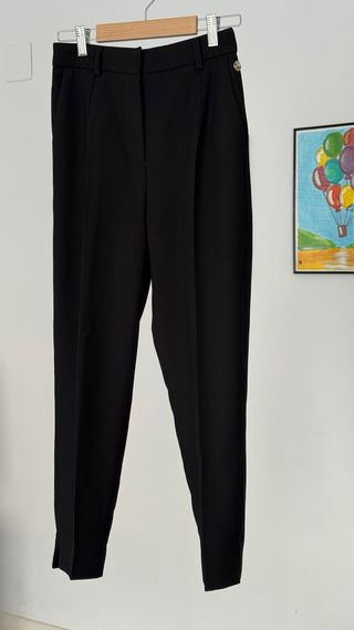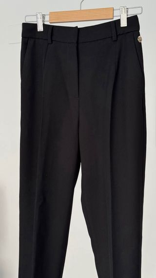 Pantalones negros de tela. - Cintura con cierre de botón y cremallera. - Corte recto.
