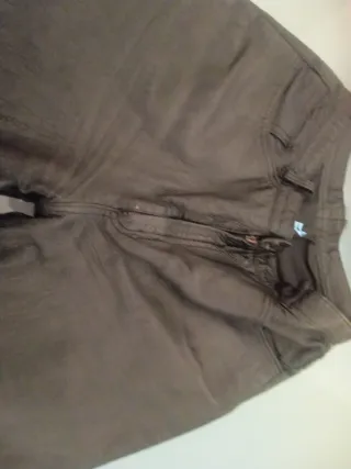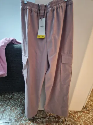 Conjunto de pantalones de diferentes estilos y colores. 4€todos - Pantalón marrón liso. - Pantalón negro liso. - Pantalón gris con estampado de puntos. - Pantalón negro liso con detalle rosa. - Pantalón marrón tipo ante.