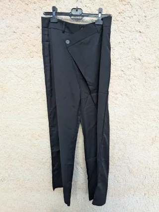 Pantalones negros de corte moderno, ideales para esta temporada. - Diseño asimétrico en la parte delantera. - Cierre con botón. - Tejido de calidad.