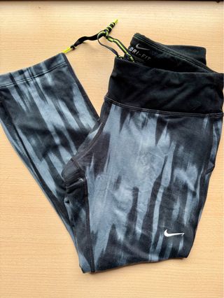Leggings pirata de la marca Nike, ideales para entrenar. Forro interior perfecto para invierno - Tecnología Dri-Fit para mayor transpirabilidad. - Diseño estampado en tonos grises y negros. - Cintura elástica con cordón ajustable. - Logo de Nike en la pierna