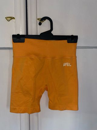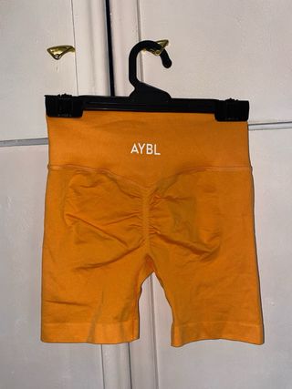 Shorts deportivos de cintura alta en color naranja vibrante. Perfectos para entrenar. - Tejido elástico y cómodo que se ajusta al cuerpo. - Diseño sin costuras. - Logo de AYBL en blanco. - Fruncido en el culo.