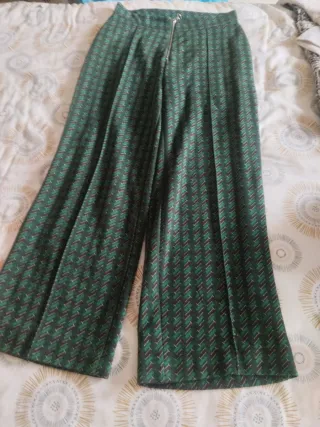 Pantalón de Zara con un llamativo estampado. - Diseño de pierna ancha. - Cremallera frontal. - Estampado geométrico en tonos verdes y marrones.