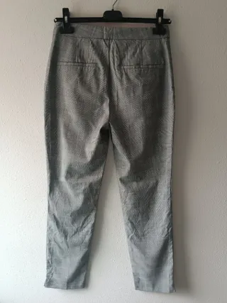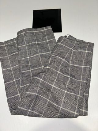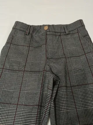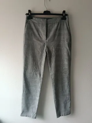 Pantalón de cuadros tiro medio, tono gris. Bolsillos laterales abiertos. Largo tobillero. Cierre frontal con cremallera, botón y gancho metálico. Muy poco uso, en perfecto estado.