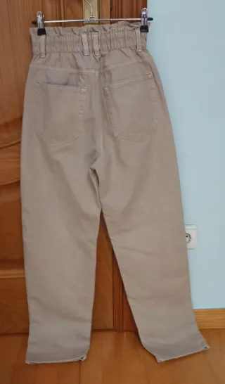 Lote de tres pantalones de mujer.Dos pantalones, ambos marca Pull and bear, unos color azul con rotos, los otros color marrón con bolsillosy altos de cintura ,el tercero marca Zara,con bolsillos laterales, como se ve en las fotografía, usados un par de veces, los marrones talla M, los azules talla 36, los negros talla 34, 8 euros cada uno - Talla: M - Marca: Zara - Color: Beige - Estilo: Paper bag waist