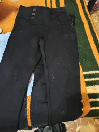 Pantalones de vestir negros para mujer, con un diseño de cintura alta y detalle de botones. - Cintura alta. - Cierre de cremallera lateral. - Detalle de tres botones en la parte frontal superior.vendo los 3 por 10=e