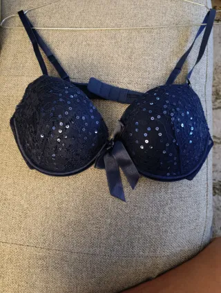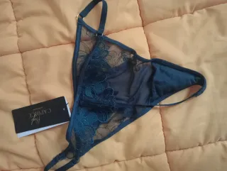 Conjunto de lencería femenina con un diseño elegante y llamativo. - Detalle de encaje y lentejuelas en azul noche - Lazos decorativos en la tanga - Tirantes ajustables. - Talla 95B - Talla 40 de tanga - Nuevo con etiqueta