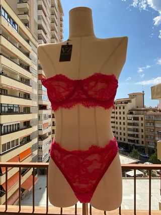 Conjunto de lencería femenina de diseño sin uso. Sujetador talla 100 y braga L.