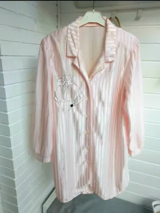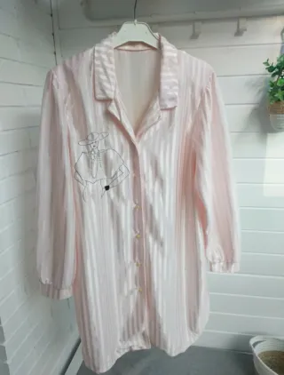 Camisola para dormir súper cómoda, perfecta para un descanso elegante y relajado. Confeccionada en un delicado tono rosa con sutiles rayas verticales, tiene un cuello clásico, cierre de botones y manga larga con un bordado lineal de una figura sofisticada en el pecho que añade un toque de arte y personalidad a la prenda. El tejido es ligero y suave, muy agradable al tacto por lo que es ideal tanto para dormir como para disfrutar de mañanas tranquilas con un toque chic. Medidas: hombros: 43 cm, pecho: 51, largo: 88. Es una talla 46 pero talla como una 40/42. Ver medidas! - Envío rápido y cuidado 🚀