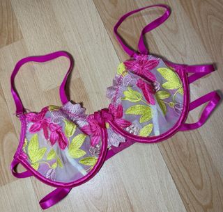 Conjunto de lencería con estampado floral en tonos rosas y verdes. Es precioso y está en muy buen estado. - Incluye sujetador, braguitas y liguero. - Diseño delicado y femenino. - Perfecto para una ocasión especial.