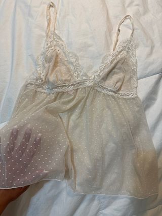 Preciosa camisola babydoll de encaje beige. Es delicada y femenina. - Talla única. - Diseño con lunares. - Encaje en el escote y los tirantes.