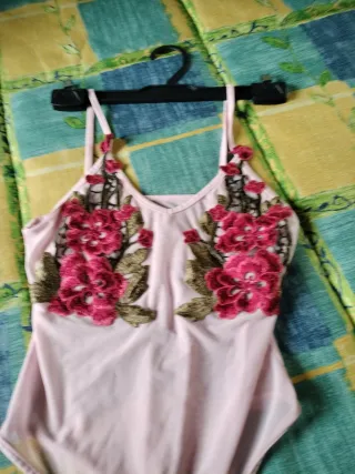 Body de tirantes con un diseño delicado y femenino. Presenta un detalle de flores bordadas en la parte delantera. - Tirantes finos. - Flores bordadas en tonos rojos y rosas. - Tejido suave y elástico.