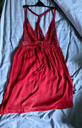 Preciosa lencería roja de encaje. Incluye camisón y braguitas. El conjunto está en perfecto estado y es ideal para una noche romántica. - Camisón de encaje con tirantes finos. - Braguitas a juego. - Talla única.