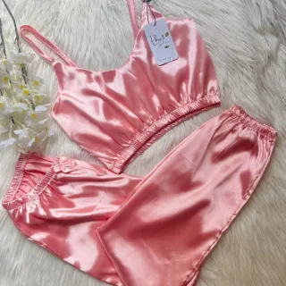 Conjunto de pijama de dos piezas en satén. - Top con tirantes finos y elástico en la cintura. - Pantalón largo con cintura elástica y lazo decorativo. Disponible en todas las tallas Desde la xs hasta la XL En colores surtidos Blanco Negro Rosa Vino tinto Rojo