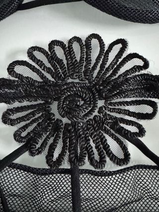 Corsé negro con un diseño delicado y elegante. - Detalle de flores tridimensionales. - Adornado con pequeñas perlas. - Tejido de malla transparente en la parte inferior. - Tirantes ajustables.